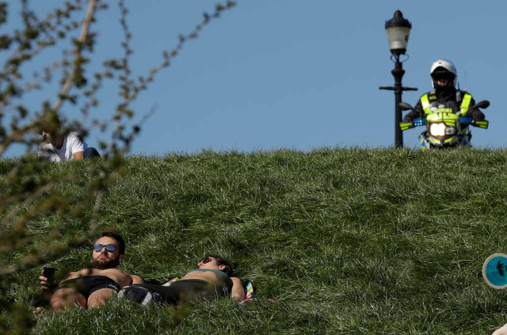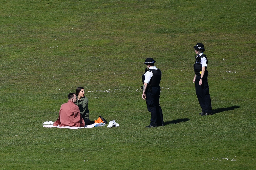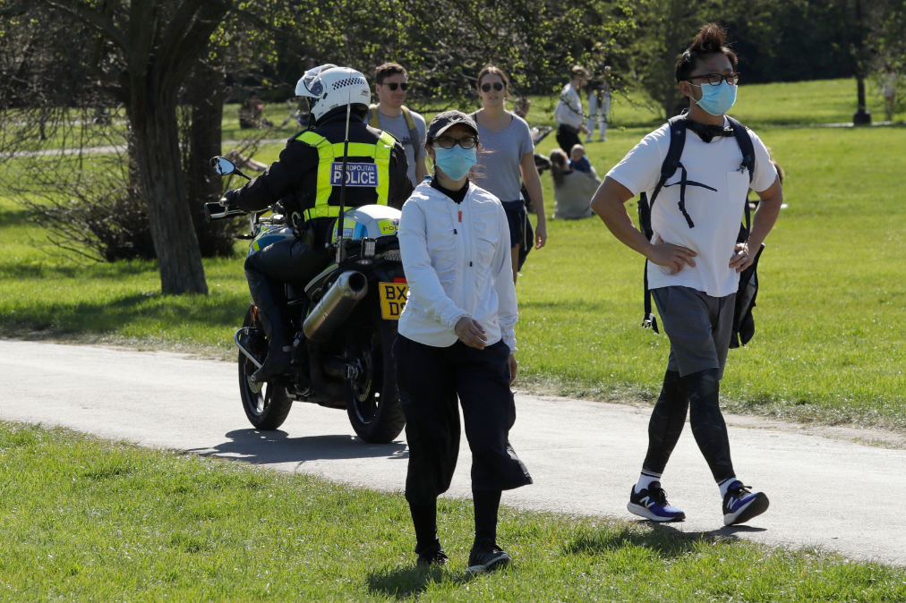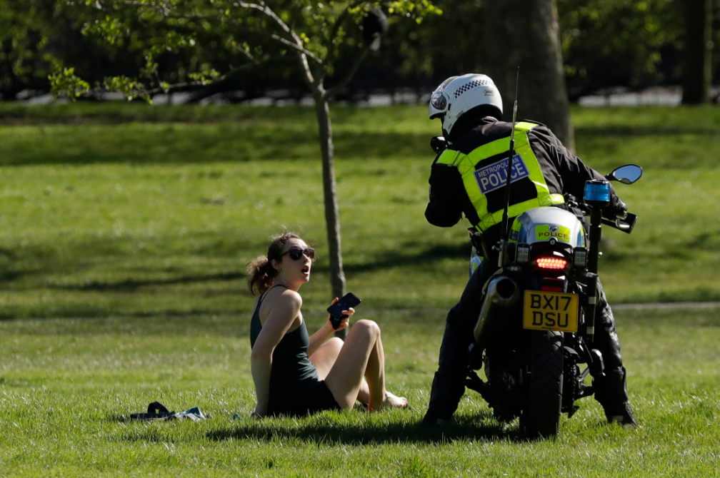 4月5日,在英国伦敦的普里姆罗斯山,警察劝离户外聚集者。新华社/美联