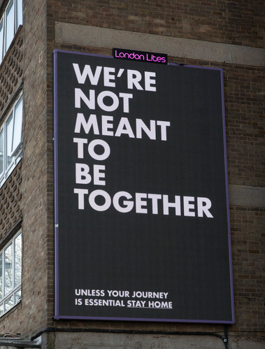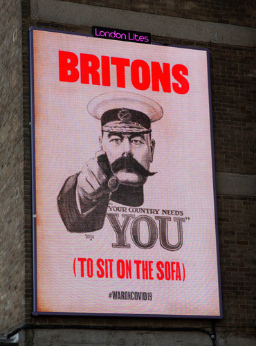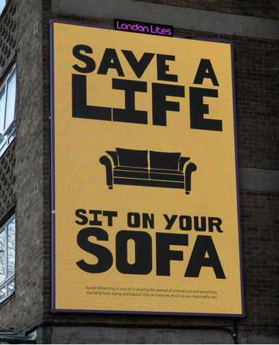 4月3日,英国伦敦街头的宣传海报劝导人们不要出门,海报上写着“英国人,你的国家需要你(坐在沙发上)”。新华社记者韩岩摄