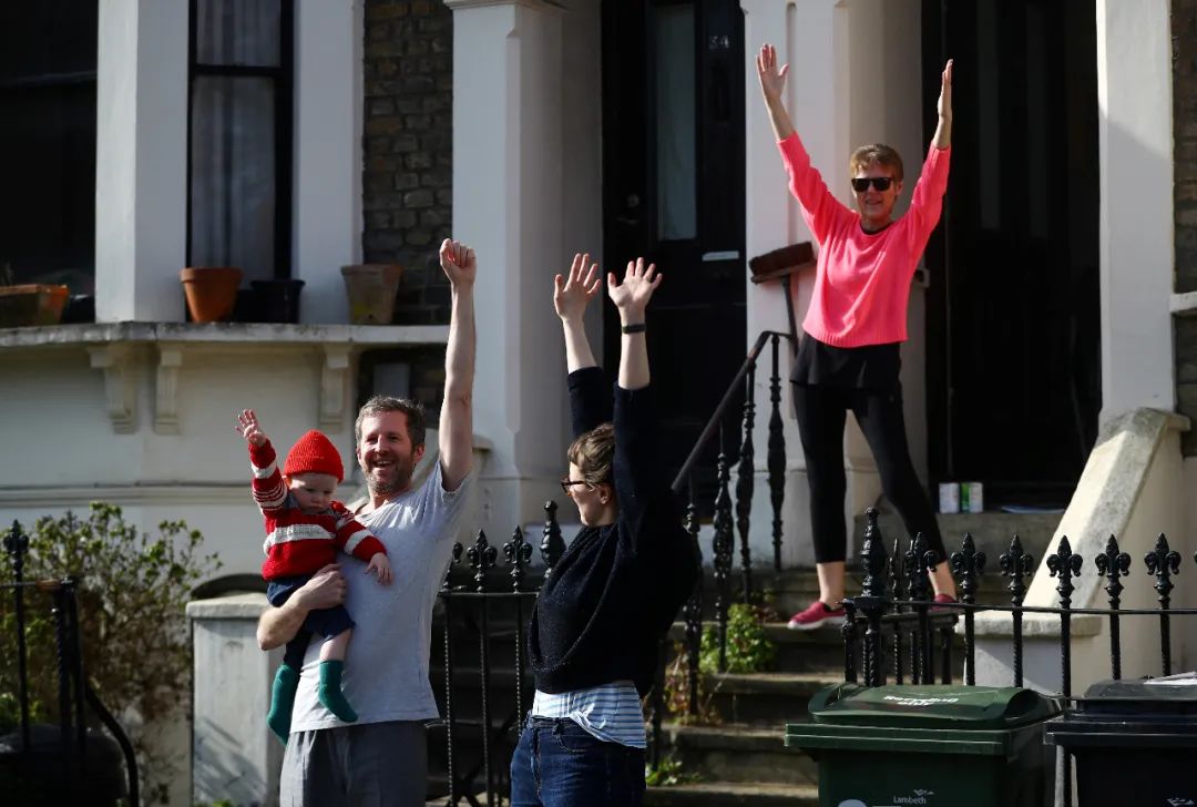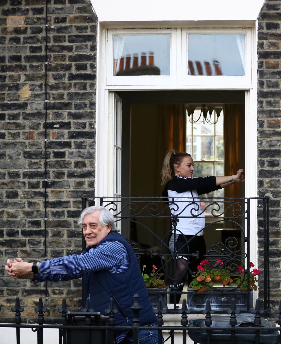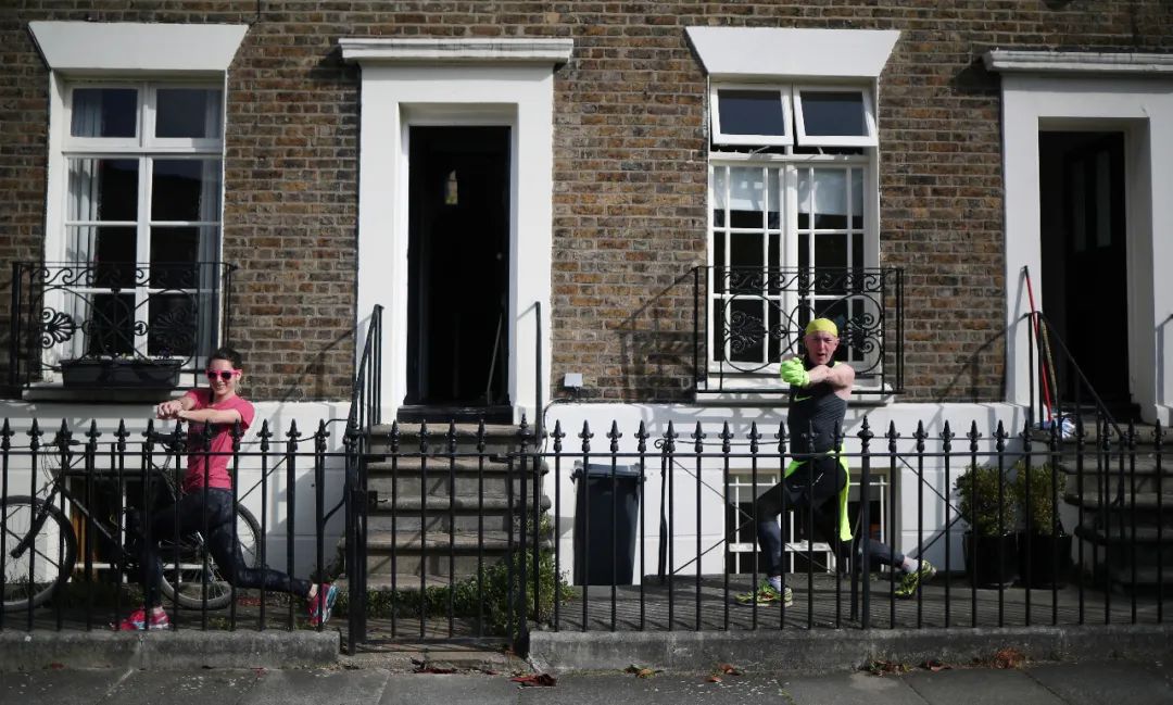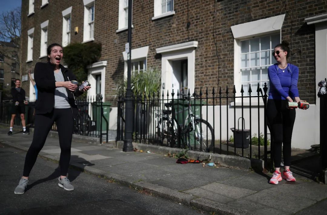4月4日,在英国伦敦,居民在家门口参与“健身课”。由于新冠肺炎疫情影响,当地民众被要求待在家中,禁止非必要外出。不少居民自发在家门口参与“健身课”,和邻居们一起强身健体。新华社/路透
