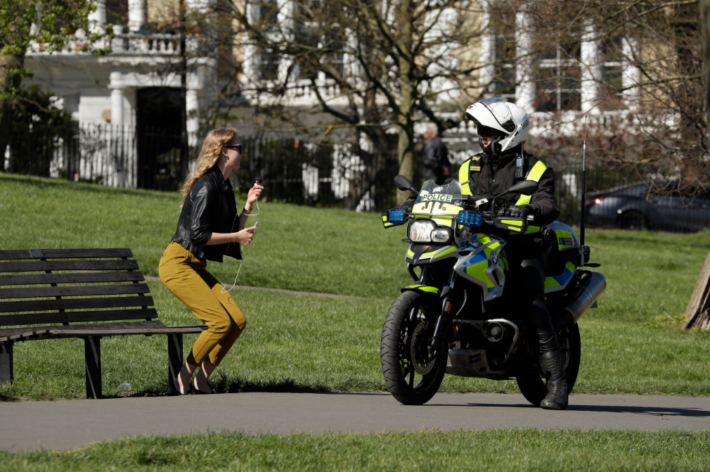 4月5日,在英国伦敦的格林尼治公园,警察与一名男子对话。新华社/美联