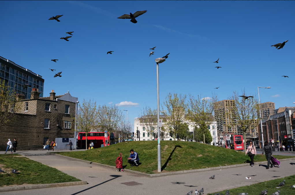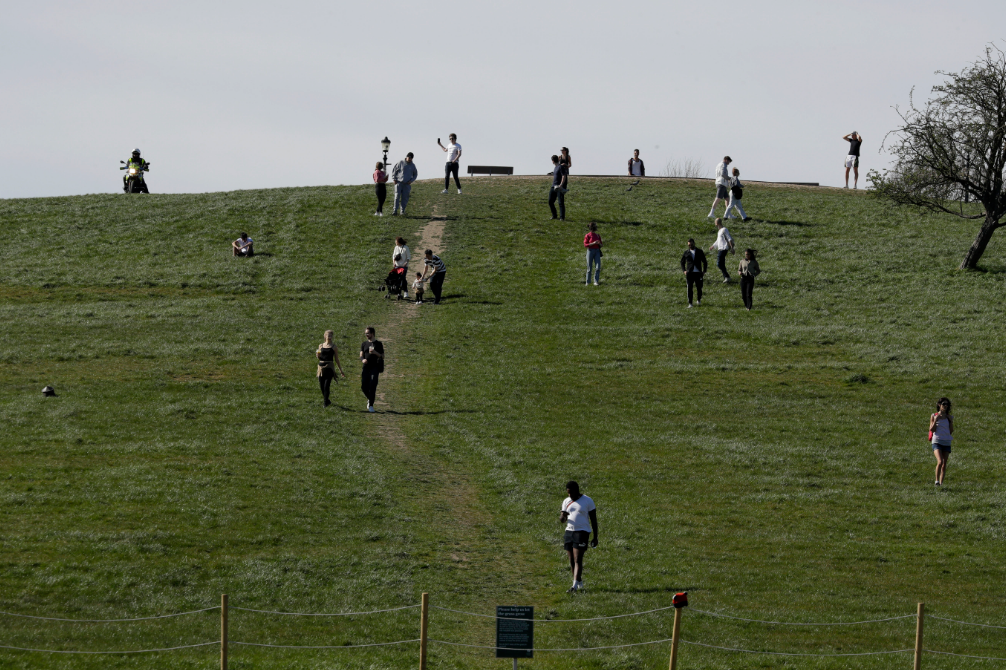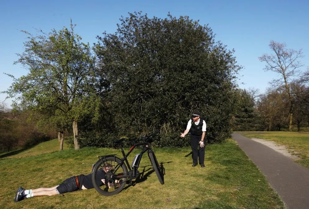 4月5日,在英国伦敦的普里姆罗斯山,警察(左上)喊话劝离户外聚集者。新华社/美联