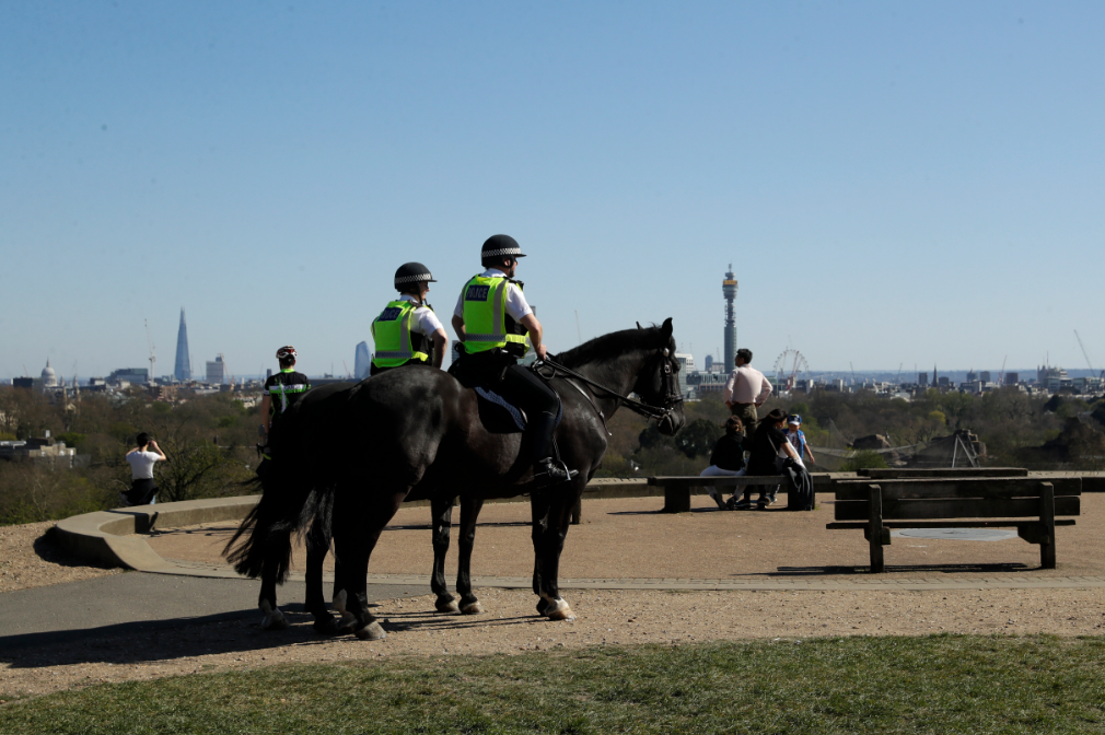 4月5日,在英国伦敦的普里姆罗斯山,骑警准备劝离户外聚集者。新华社/美联