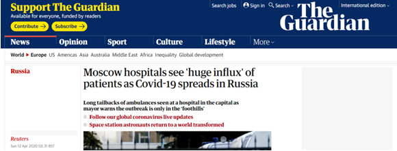 《卫报》12日报道称,随着感染人数和死亡病例增加,“大量涌入”的病患给莫斯科医院带来了压力。克里姆林宫表示,为阻止疫情蔓延,尽管莫斯科和其他许多地区已实施了近2周的“封锁”措施,但莫斯科医院“仍被逼到了极限”。