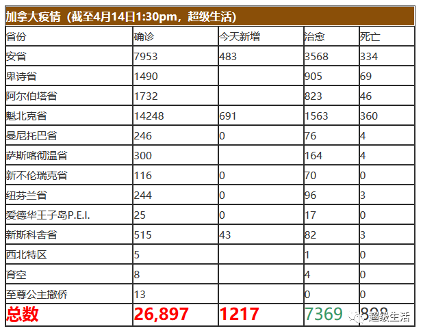 才半天过去,加拿大死亡新增118例至898例,疫情以来首次破百。不过,也有很多好消息,包括多个省份新增为零,今天纽芬兰、PEI、新不伦瑞克以及曼尼托巴省没有新增病情。