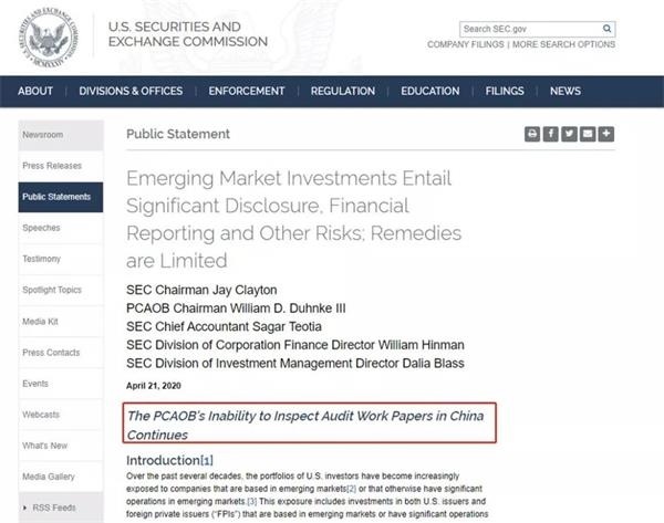 更早是在4月21日,美国证券交易委员会(SEC)在其官方网站上发布一封重磅声明,指出新兴市场存在信息披露不充分、无法获取审计底稿等问题,存在重大投资风险。
