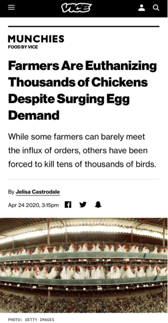 △《Vice》新闻报道:尽管鸡蛋需求量激增,一些农民还是不得不对上万只鸡施行安乐死。