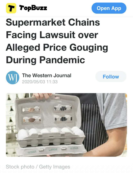 据美国新闻网站《西部日报》 5月3日的报道,美国加利福尼亚州北部的地方法院对包括沃尔玛在内的多个连锁超市提起诉讼,理由是商家哄骗物价导致春季鸡蛋的价格急速上涨。该诉讼称,从新冠肺炎疫情开始到三月底,鸡蛋的价格几乎翻了三倍。该诉讼严厉指责了鸡蛋生产商,批发商和零售商在危机中充分利用消费者对鸡蛋的需求来获得不公平利润的行为。