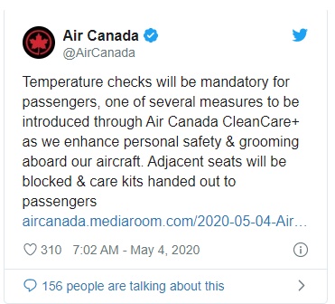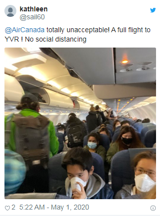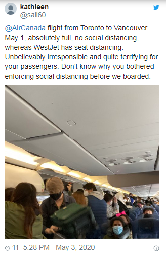 一名5月1日搭乘加航多伦多飞往温哥华班机的旅客,拍下这张在机上人挤人的照片传上社群媒体,这名乘客Kathleen Hamilton还说:“明显爆满,没有社交距离,并未像西捷航空实施座位距离。这对乘客来说,根本是难以置信的不负责任与令人深感恐惧的事,不知道为什么在我们登机前你还费心加强社交距离。”