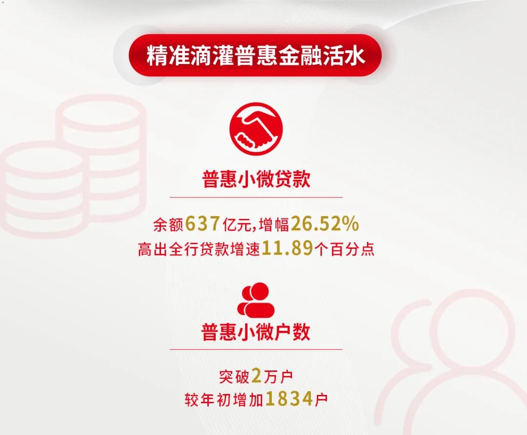 **加快零售转型,市场份额和客户基础不断夯实。**资产管理规模(AUM)突破7000亿元,零售存款突破3500亿元,较年初增长22.14%;贷款规模超过4400亿元,增幅22.39%,创近三年来最好水平。零售存款、贷款增量对全行贡献均在40%以上,贷款余额占比首次突破30%,达到30.76%。零售存、贷款全国市场份额继续保持双提升,在134家城商行中规模均稳居第一。零售业务收入突破200亿元,利息收入同比增长31.6%;贷款不良率下降0.03个百分点,资产质量继续保持上市银行领先水平。助力“美丽乡村”建设,升级“富民直通车”服务体系,富民卡累计发卡达90万张,支持超过1000个特色民宿院落建设,“千院计划”目标提前完成。