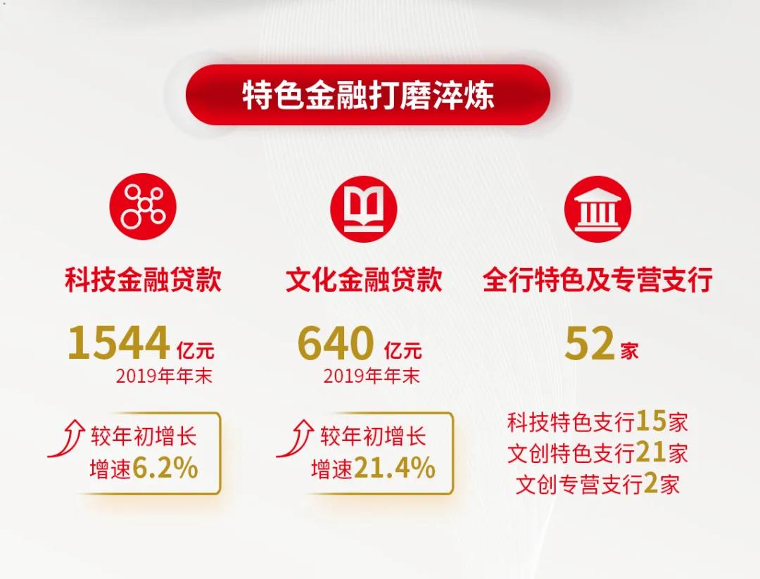 **坚持特色经营,科技金融和文化金融比翼齐飞。**科技金融方面,发布“北京银行科创板金融服务方案”,支持科创板申请企业48家,累计授信85亿元;升级“智权贷”、加快“前沿科技贷”推广及“研发贷”等新产品落地,制定《北京银行进一步深化科技金融发展战略指导意见》;科技金融创新模式获人民银行、银保监会首次发布的《中国小微企业金融服务报告》专题报道。截至2019年末,科技金融贷款余额1544亿元,较年初增速6.2%。文化金融方面,发布“文旅贷”金融服务行动计划、“创意设计贷”及影视全产业链专属产品“影视贷”,支持《破冰行动》《庆余年》及《烈火英雄》《决胜时刻》《中国机长》“中国骄傲三部曲”等优秀影视剧制作发行;荣获“2019中国文旅企业最佳服务银行”称号,文化金融和文创专营支行获得北京市委、市政府充分肯定;截至2019年末,文化金融贷款余额640亿元,较年初增速21.4%。2020年以来,围绕文化企业受疫情影响现状,为文化企业量身定制延期、续期方案,推出“文旅餐饮振兴扶持专项计划”,为文旅和餐饮企业提供不少于100亿元专项信贷资金。北京银行文化创客中心主动延长入孵企业免费办公时间,疫情期间举办线上主题文化活动12场。