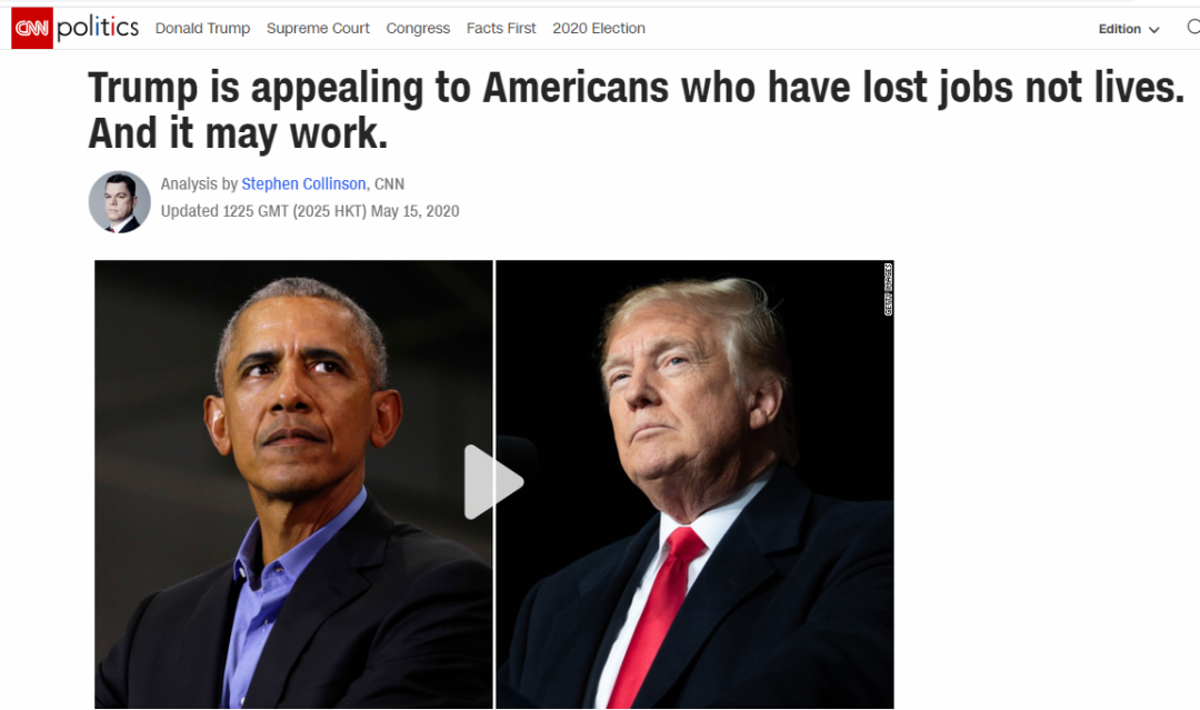 “特朗普在取悦那些失去工作的美国人,而不是那些失去生命的”,CNN在其报道的标题中就开门见山地写道,“而这个策略可能还真会起作用”。