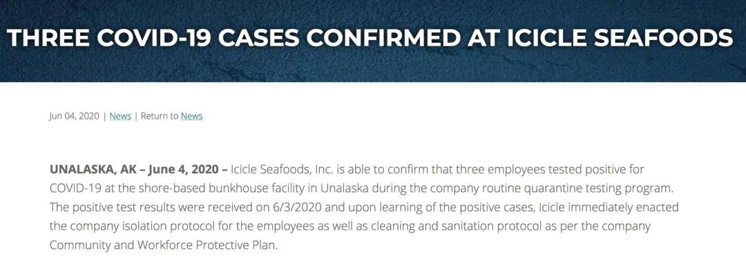 6月4日,美国阿拉斯加的冰柱海鲜公司,也确认有3名员工确诊新冠。美国目前疫情虽然严重,但是阿拉斯加病例很少,在50个州里排名倒数第二,只有625个确诊病例。