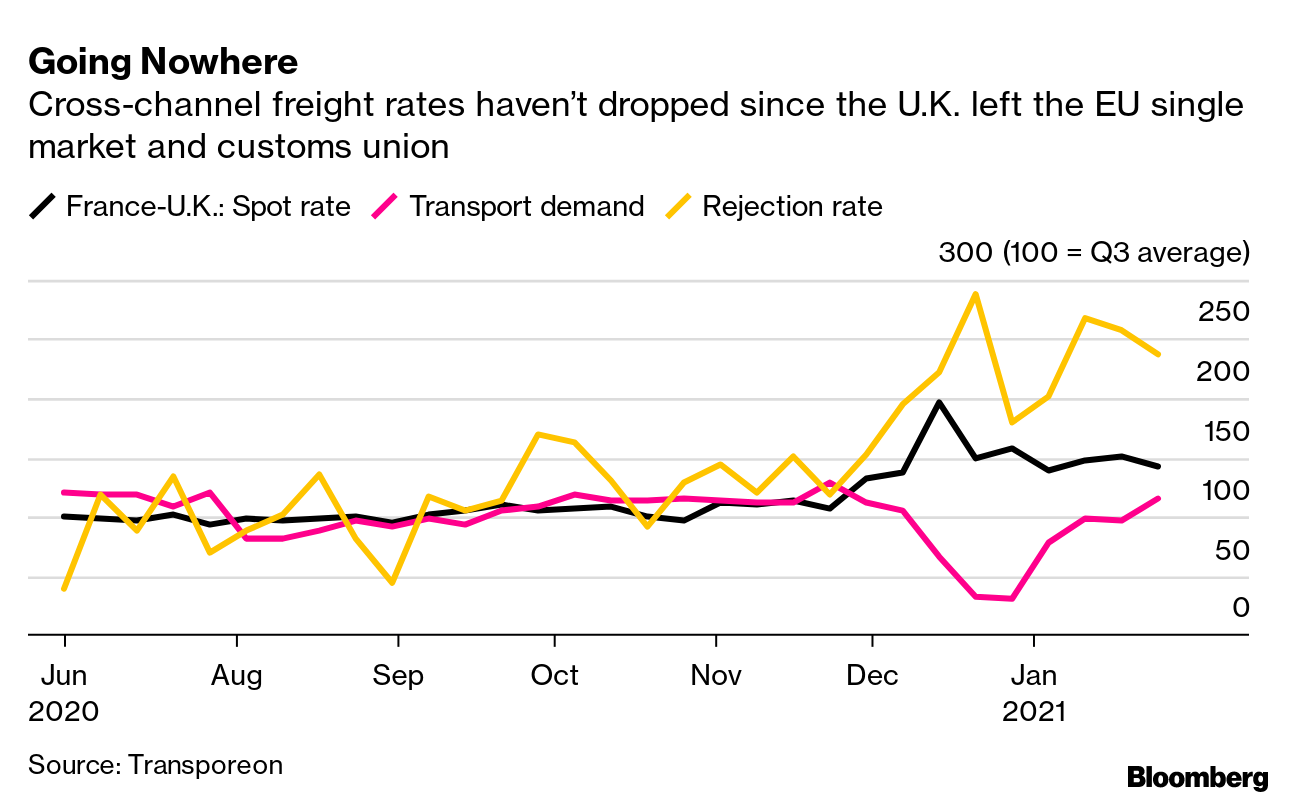 货运公司正在避开英国,根据全球物流平台Transporeon的高频数据显示,上周拒绝合同的比率远高于第三季度平均水平。这至少部分是因为运输公司受到延误的影响 —— 英格兰东南部阿什福德的卡车司机在排队等候的中位时间约为15小时。