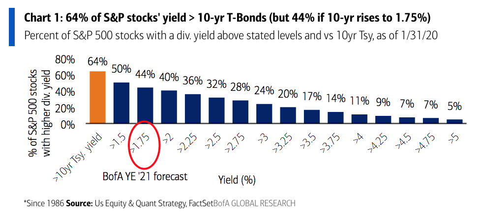 然而,美国银行认为“没有替代选择”的时代可能即将结束。目前,标普500指数中超过60%的股票的股息率高于10年期国债收益率,后者约为1.13%。如果到年底基准利率上升至1.75%——美国银行目前的观点——那么这一比例将降至44%,这将使得对股票的乐观“没有替代选择”口号变得“不那么具有说服力”,分析师们写道。