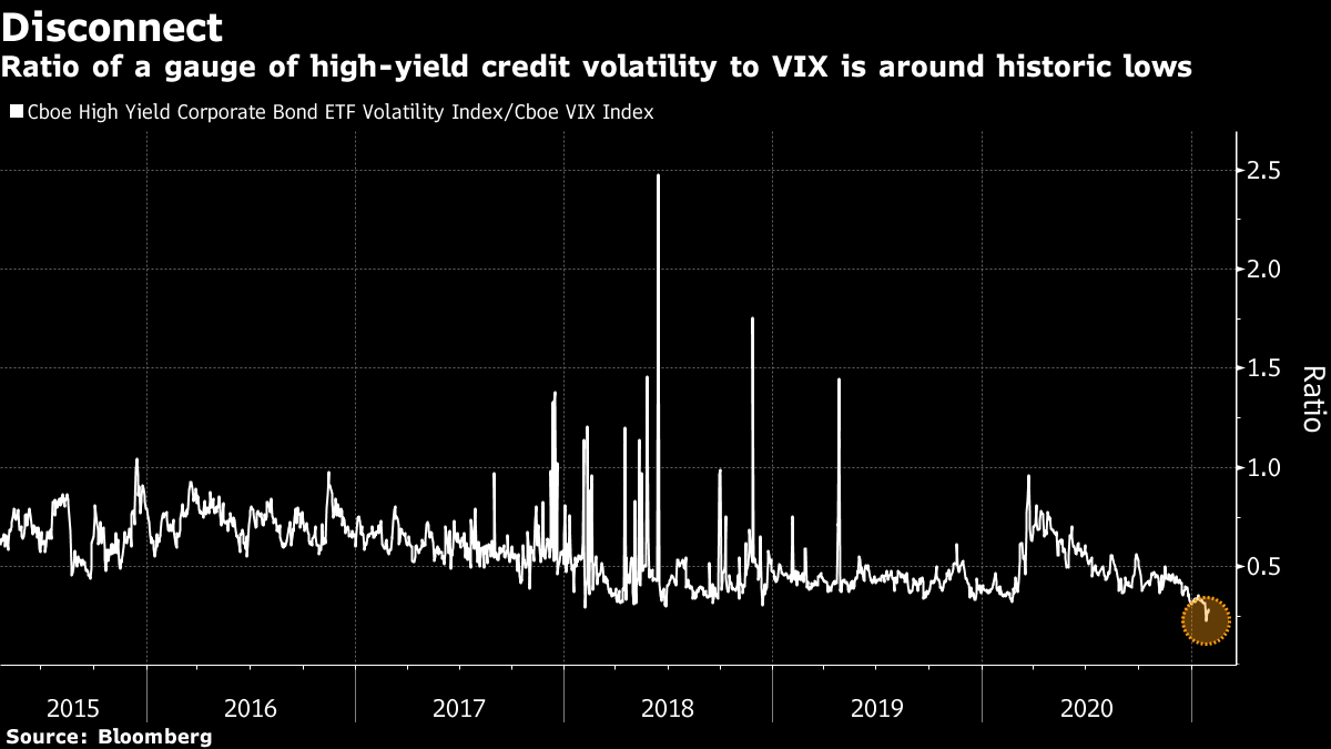 信用市场的平静,特别是垃圾债券市场的平静,为投资者提供了一个机会,可以购买便宜的对冲工具,至少在 Tallbacken Capital Advisors LLC 的迈克尔·普尔维斯看来是这样。彭博数据显示,自 2015 年以来,Cboe高收益公司债券ETF波动率指数与VIX指数的比率接近历史低位。普尔维斯认为,鉴于隐含波动率影响期权定价,这意味着信用市场提供了相对廉价的保护。