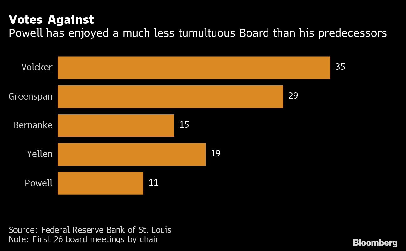 正如彭博新闻本周报道的那样,鲍威尔享受着比他的前任更少的董事会成员的异议。但这种宁静可能不会持续。上周,达拉斯联邦储备银行行长罗伯特·卡普兰表示,他预计关于缩减资产购买的“非常热烈的辩论”。