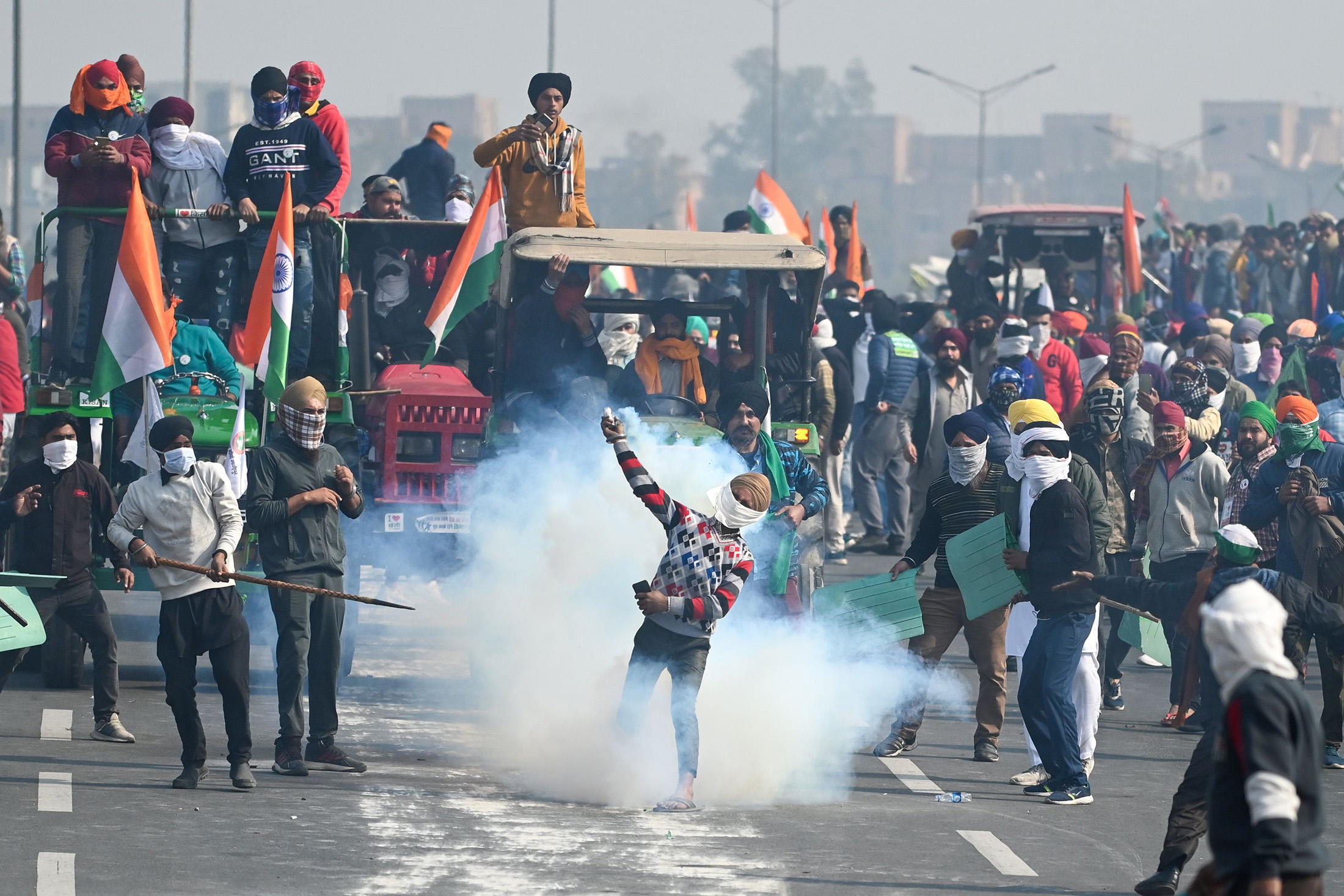 一名农民在新德里的一次集会中,扔回了警察发射的催泪弹