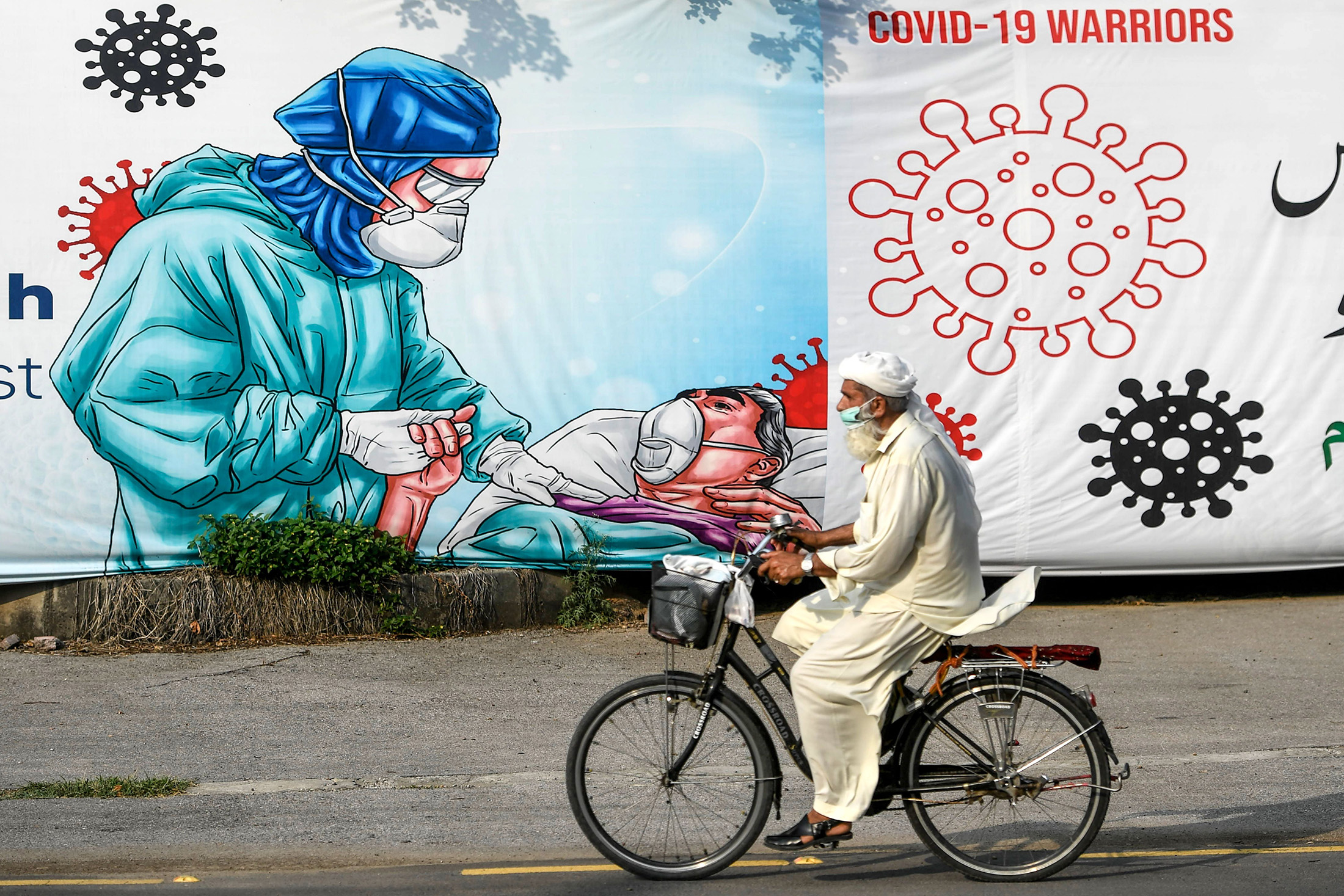 7月份在伊斯兰堡为抗击新冠病毒的卫生工作者致敬的横幅。摄影师:Aamir Qureshi/AFP