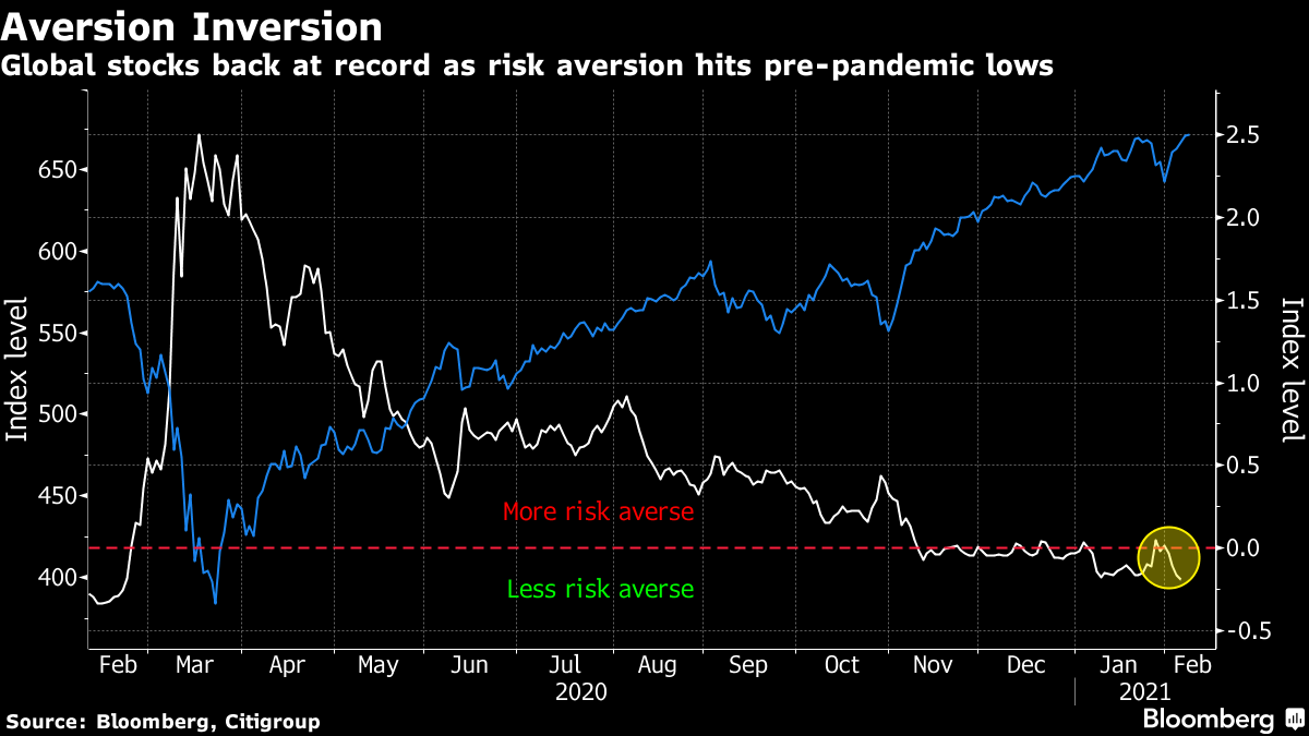上个月底,随着零售投资者骚乱扰乱市场,该指数短暂进入正值区域,但很快又恢复向下走势。随着全球股市的MSCI AC World指数再次创下历史新高,风险厌恶情绪正在逐渐消退。但是,从加密货币到科技IPO再到SPAC上市,各种市场继续出现过度迹象,现在可能不是投资者太勇敢的时候。