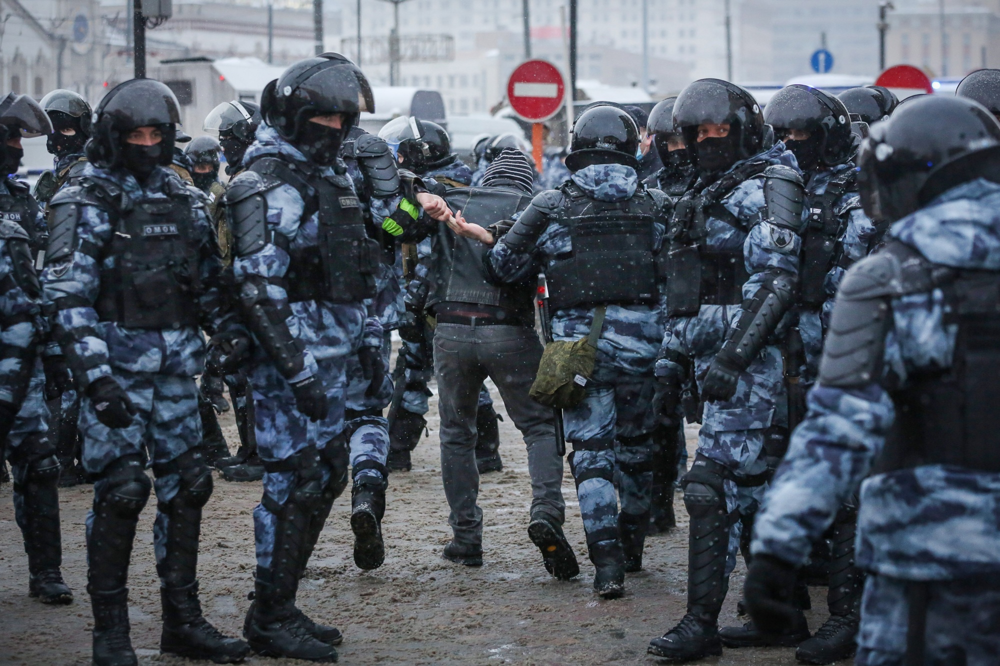 防暴警察在1月31日莫斯科支持俄罗斯反对派领袖阿列克谢·纳瓦尔尼的示威活动中拘留了一名抗议者。