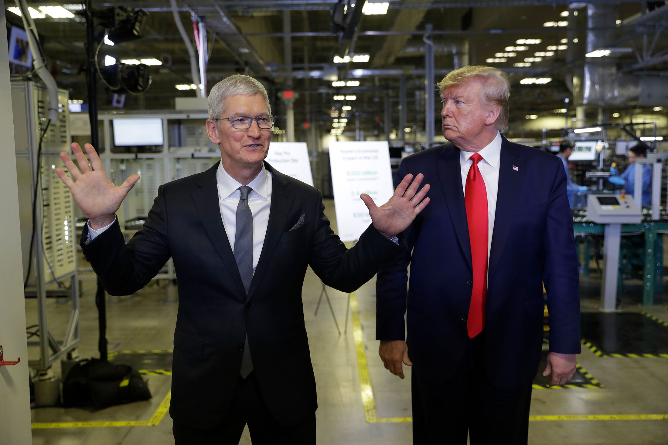 库克和特朗普于2019年11月20日在奥斯汀的一家苹果制造工厂参观。摄影师:埃文·沃奇/AP照片2019年11月,即总统大选前一年,特朗普飞往奥斯汀会见库克,并参观了苹果的Mac Pro工厂。在白宫新闻发布会的众目睽睽之下,库克称Mac Pro为一款面向创意专业人士的价值5999美元的计算机,“这是美国设计、美国制造和美国创造力的一个例子。”在另一个时刻,两人凑近一起,库克展示计算机的组件,特朗普点头表示赞同。库克指出,许多零部件来自亚利桑那州和宾夕法尼亚等地——特朗普曾承诺要在这些关键摇摆州创造更多制造业岗位。