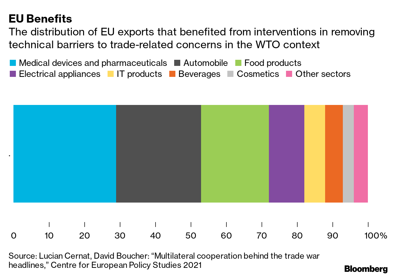 世界贸易组织技术贸易壁垒委员会在过去十年里消除了影响欧盟出口价值800亿欧元的不必要成本,根据欧洲政策研究中心的卢西安·瑟纳特和大卫·布彻尔的一篇论文。这些措施涵盖了各个领域,尤其影响了对中国、俄罗斯、阿拉伯联合酋长国、沙特阿拉伯、巴西和韩国的出口。