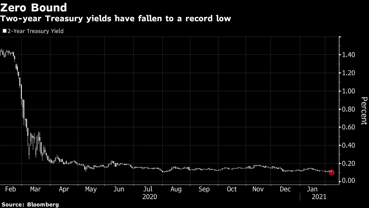 由于通胀交易带来的上行压力,大多数人的目光都集中在较长期的债券收益率上,一些人可能错过了曲线的另一端,收益率正在悄悄下滑。随着投资者寻找日益增长的现金堆的短期投资去处,两年期国债收益率本周创下历史新低。事实上,随着美国财政部利用其庞大的现金余额,数百亿美元的刺激支出在未来几个月内预计将增加。正如我的同事亚历山德拉·哈里斯所指出的那样,美国政府存款的减少为金融体系增加了现金,银行通常将这些现金投入包括国债在内的短期资产。