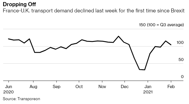 欧盟对英国的要求是不切实际的和不可行的,根据英格兰银行行长安德鲁·贝利的说法,不值得英国成为规则接受者仅仅为了达成等同协议 - 欧盟不应该期望英国比它对美国和其他司法管辖区的期望更高。中央银行家表示,如果没有达成协议,金融服务将在整个欧洲大陆上分散,增加了复杂性和成本,包括欧盟在内。**金融并不是唯一感到困难的领域。**周五发布的数据显示英国经济在2020年第四季度略微增长,但确认了自1709年以来经济最困难的一年。根据英国商会的一项调查,一半的英国出口商面临着脱欧后的困难,可能威胁到经济复苏。联合执行董事汉娜·埃塞克斯告诉彭博电视小企业受到的影响最大,在边境的文书工作方面。正如乔·梅斯报道的那样,这些公司现金流和组织能力较弱,难以应对变化,尤其是农产品出口商。实时数据强调,脱欧和疫情对贸易造成的影响并没有减轻。道路运输协会表示卡车货物急剧下降,而交通跟踪公司Sixfold表示每周的货运量连续五周低于典型水平。内阁办公室大臣迈克尔·戈夫对这些说法提出异议。英国国家统计局的数据显示,每日访问英国的船只数量比一年前低。