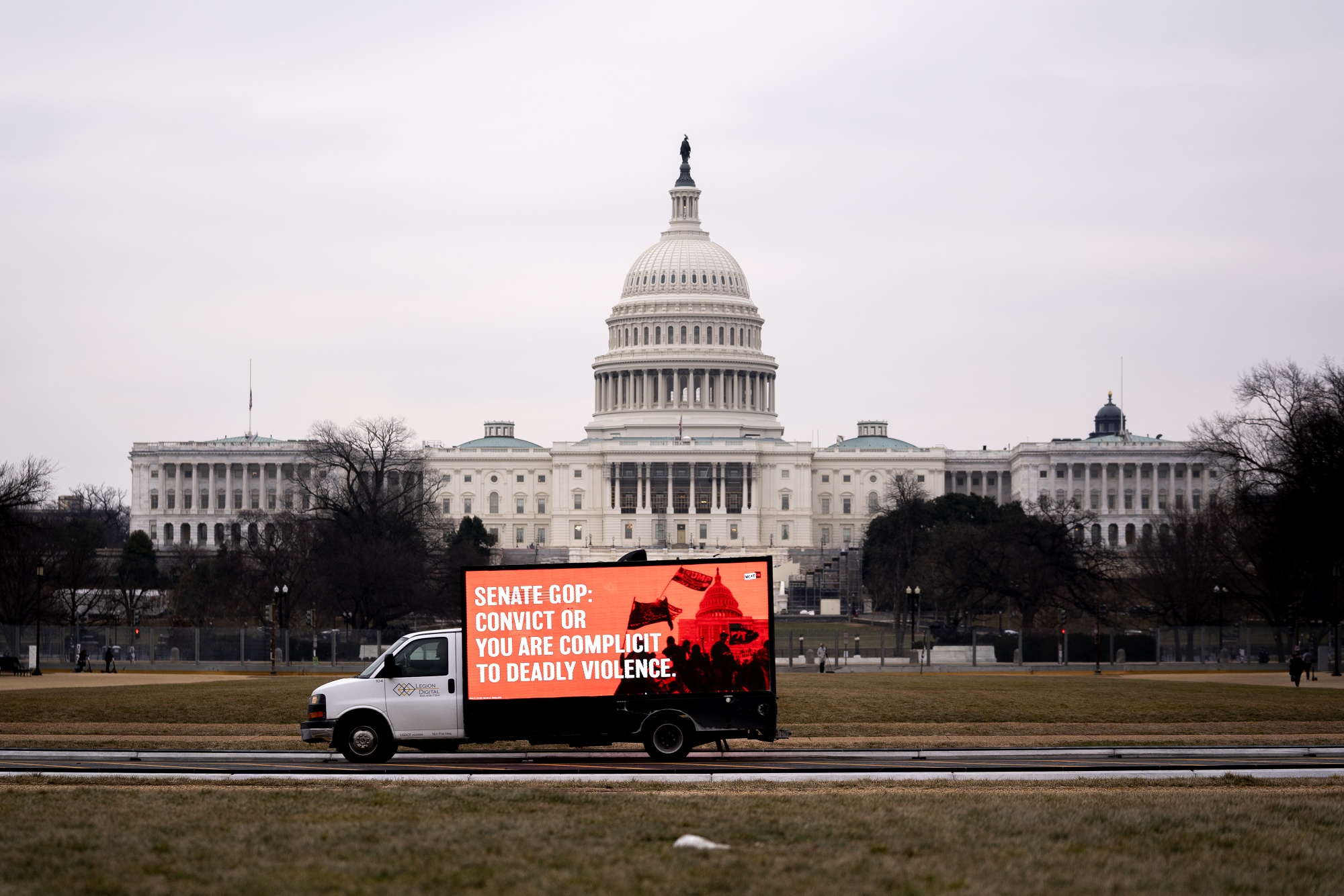 一辆卡车上有一个数字标牌,呼吁对前美国总统唐纳德·特朗普进行定罪,摄于美国华盛顿特区,日期为2月10日。