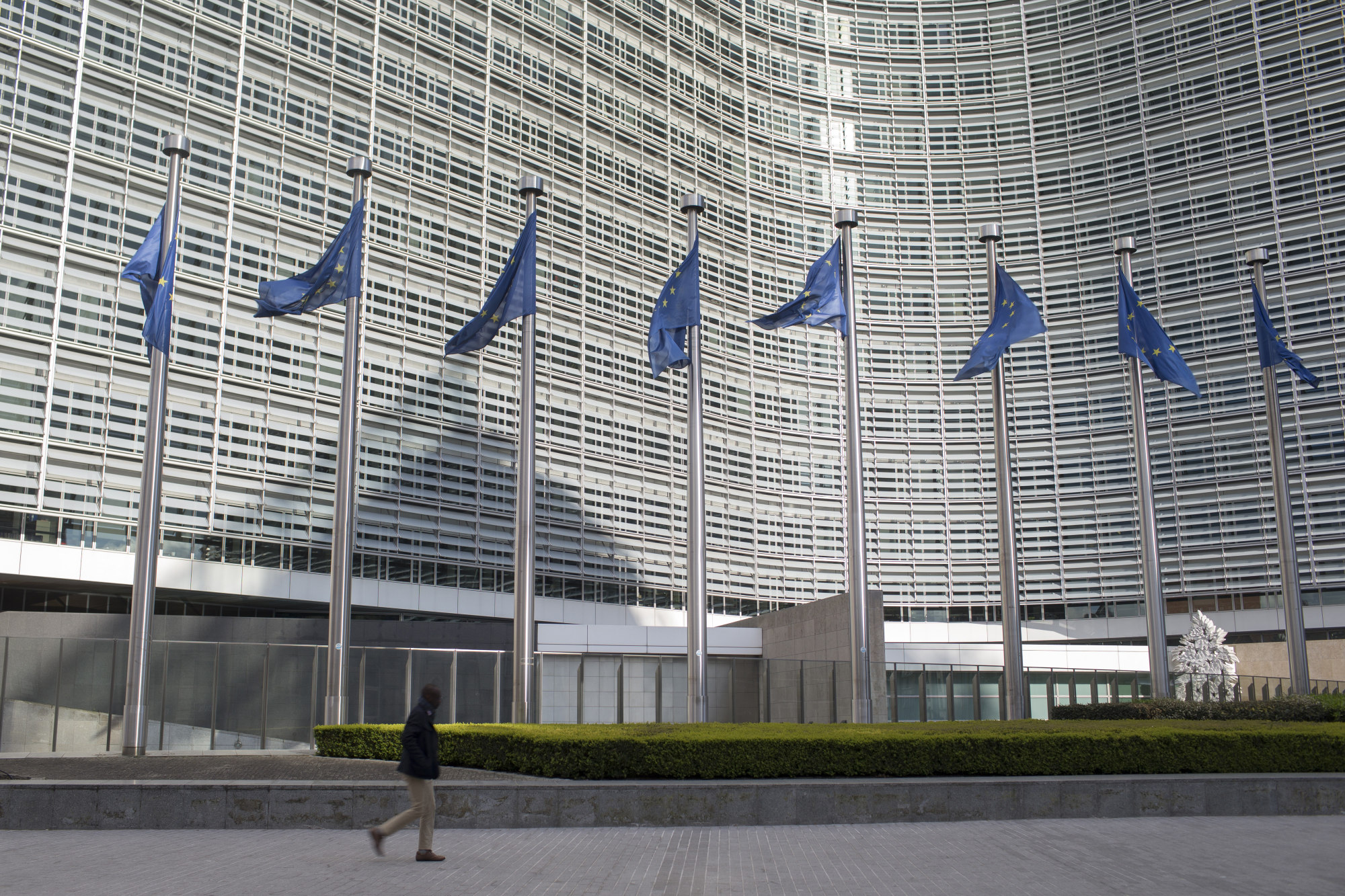一个行人经过比利时布鲁塞尔的欧洲委员会大楼。