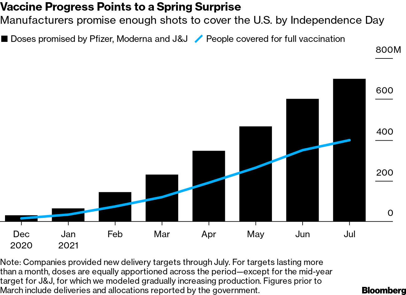 摄影师:Micah Green/Bloomberg根据彭博社的分析,美国的冠状病毒疫苗供应量在未来几周和几个月内有望翻倍,这将使疫苗接种工作得到广泛扩展。目前,美国每天只接种160万剂疫苗,这要归功于每周约1000万至1500万剂的供应量。但制造商已加快了生产时间表,可能提供数亿剂疫苗,以匹配不断增长的药房和大规模疫苗接种点的接种能力。交付的疫苗数量应该会在3月接近2000万剂每周,在4月和5月超过2500万剂每周,在6月超过3000万剂每周。尽管更易传播的新冠病毒变种构成了威胁,初步研究显示有些变种对目前的疫苗的抵抗力较弱,甚至可能更致命,但制药业的加速扩产,与第三波感染的减退相结合,可能会给美国带来谨慎乐观的理由。—David E. Rovella