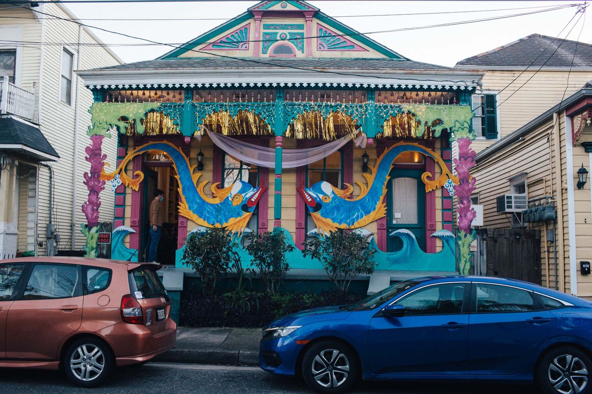 **…如果你想DIY。**由于大流行病导致狂欢节游行停摆,新奥尔良居民将他们的狂欢心情转化为充满活力、奇幻的“房屋装饰”,作为一个名为“Yardi Gras”的新传统的一部分。