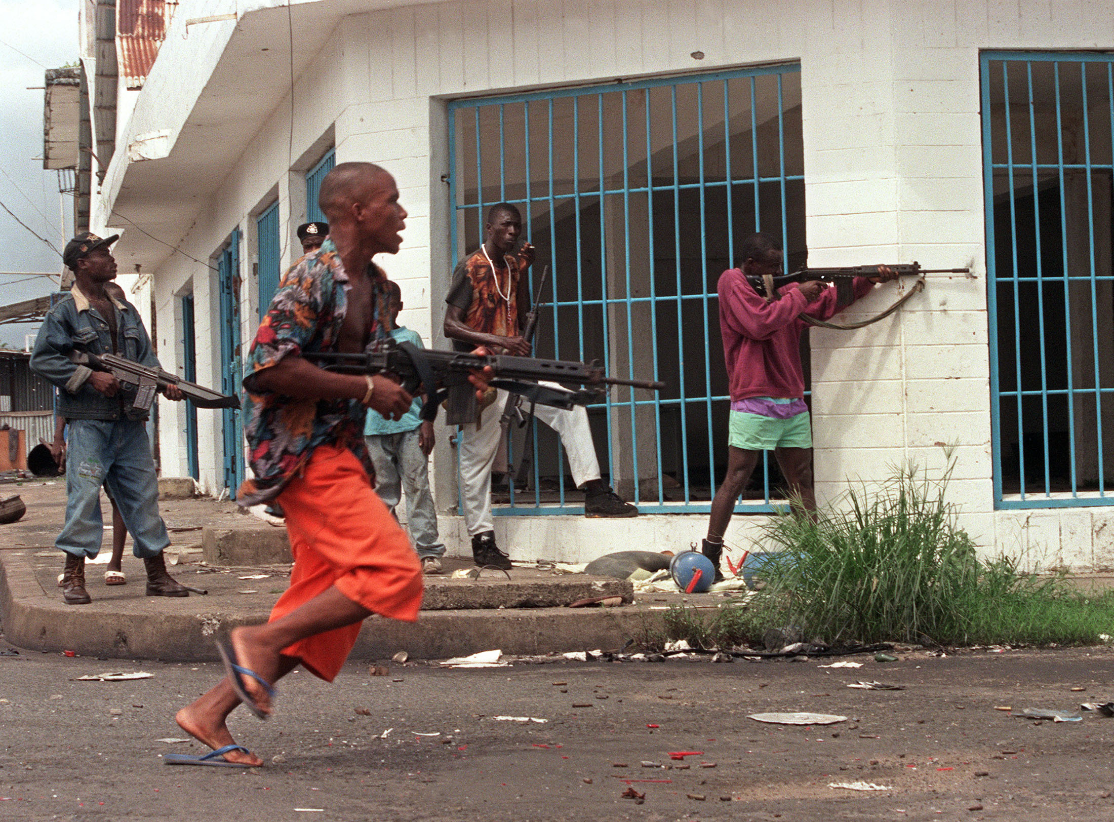 一群忠于利比里亚军阀罗斯福·约翰逊的战士在1996年在蒙罗维亚向由查尔斯·泰勒领导的部队的阵地开火。摄影师:JOEL ROBINE/AFP