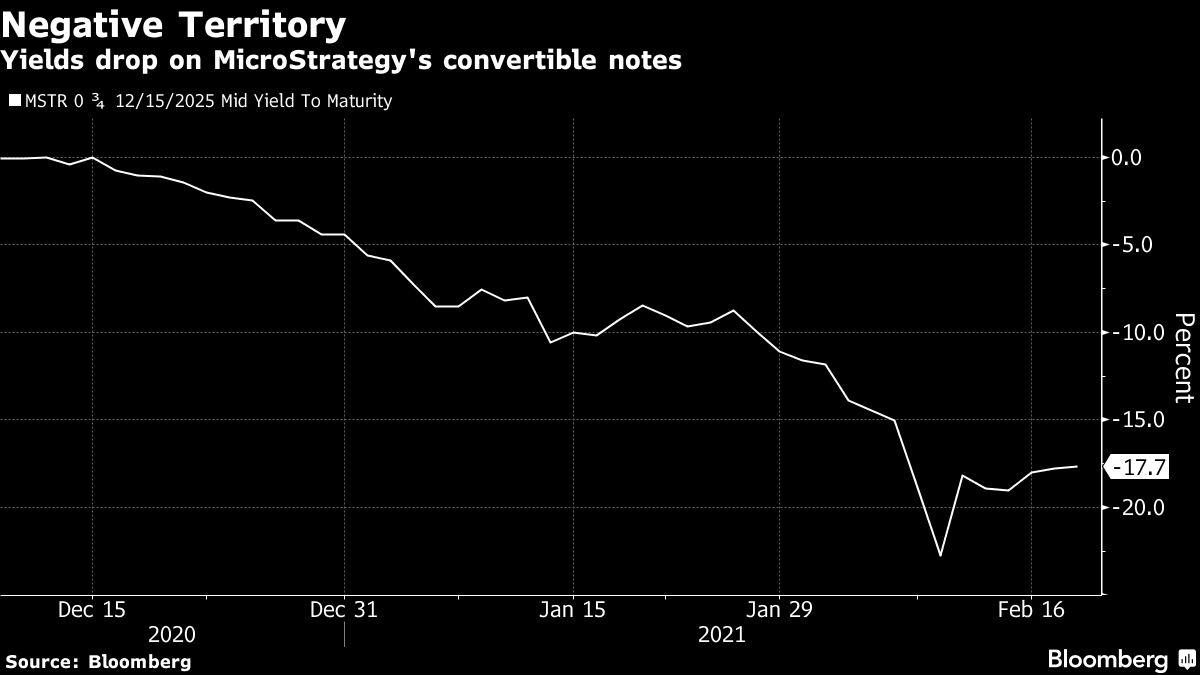 除了主要市场需求外,MicroStrategy现有的2025年12月到期债券的交易也是可转换债券的一个有趣案例。目前,这些0.75%票面利率的2025年到期债券的到期收益率为负17.7%——这个数字在本月早些时候曾低至负22.7%。