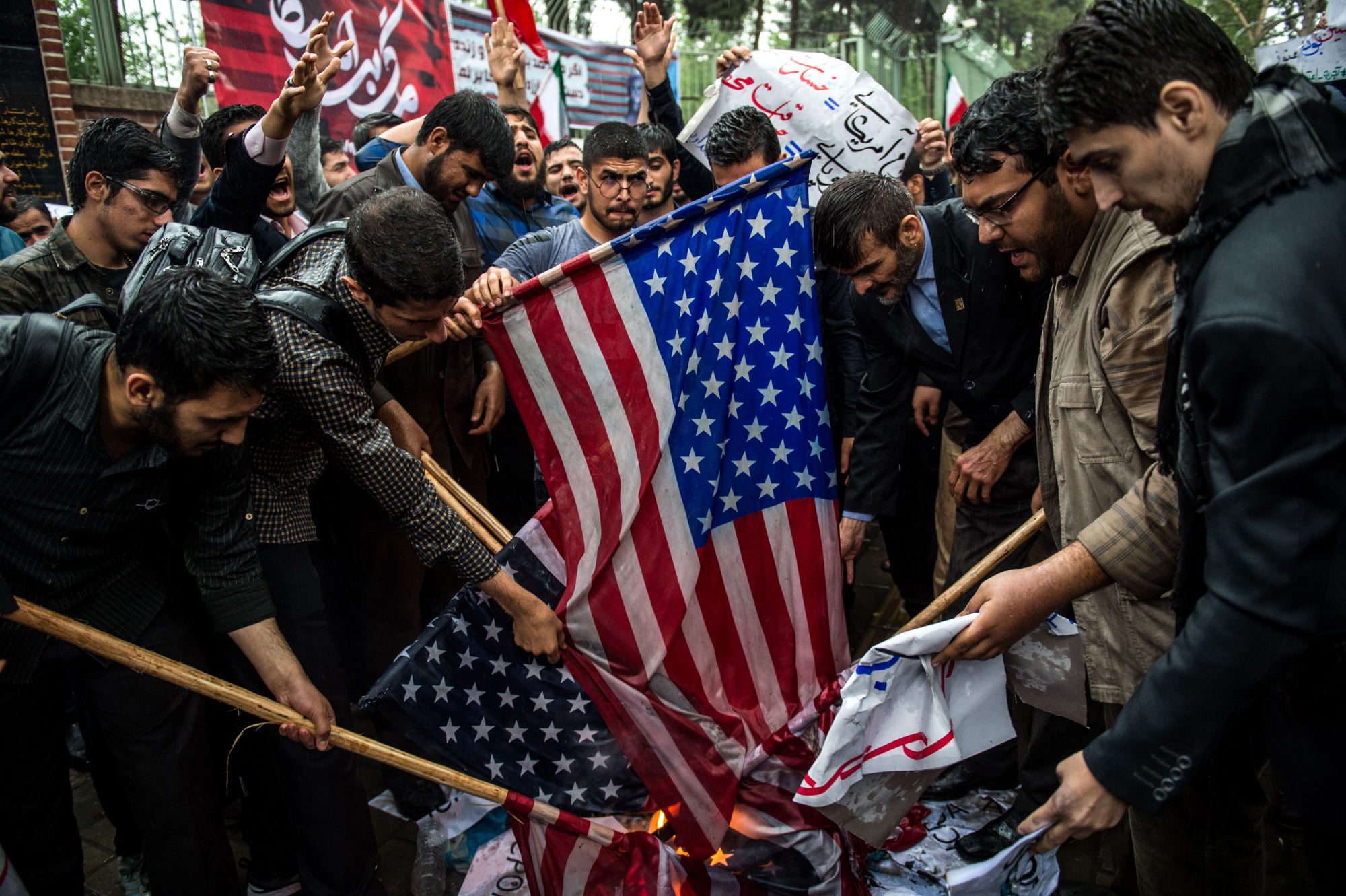 伊朗人准备在2018年5月9日的反美示威活动中焚烧美国国旗,当时美国总统唐纳德·特朗普退出了2015年限制伊朗核计划的协议,以换取与西方的和解。