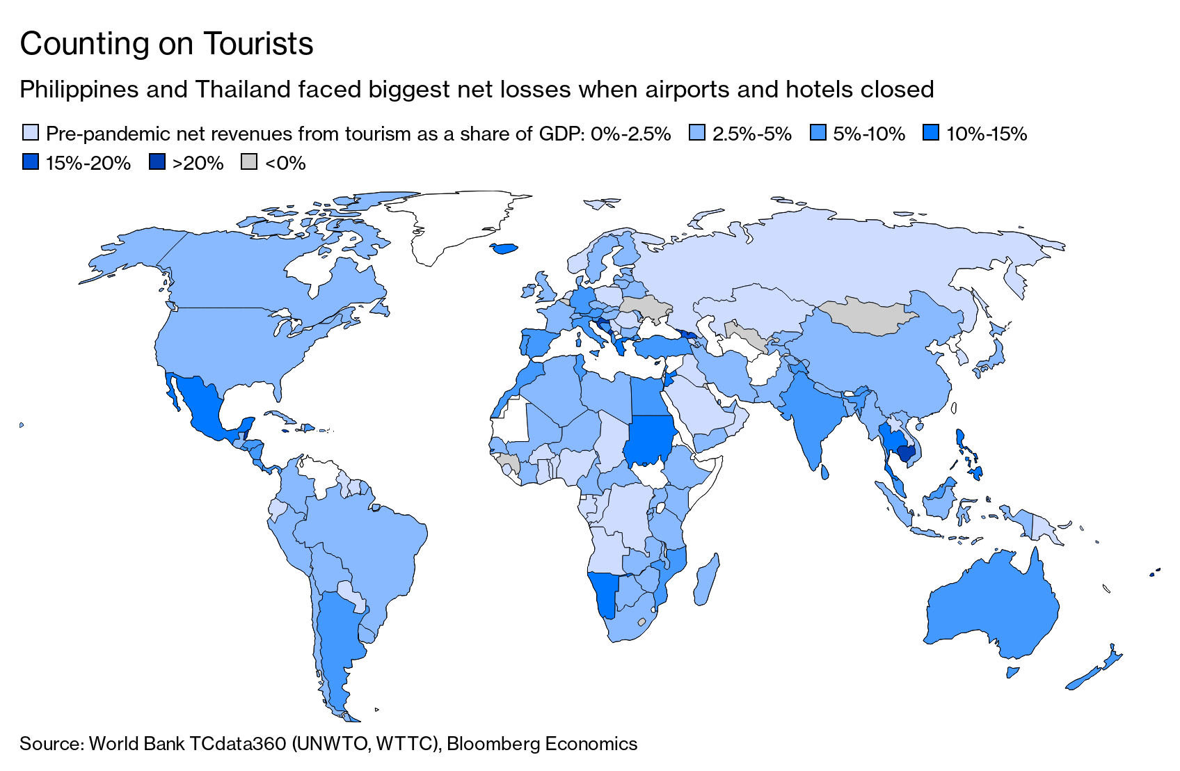 根据彭博经济学对全球最大的40个经济体的计算,菲律宾、泰国、墨西哥、西班牙和意大利在新冠疫情导致机场和酒店关闭时遭受了全球最大的净损失。这意味着这些国家在新冠危机最终结束时可以期待最大的复苏。不过,国际旅行要完全从疫情中恢复可能需要一段时间。
