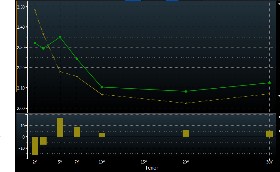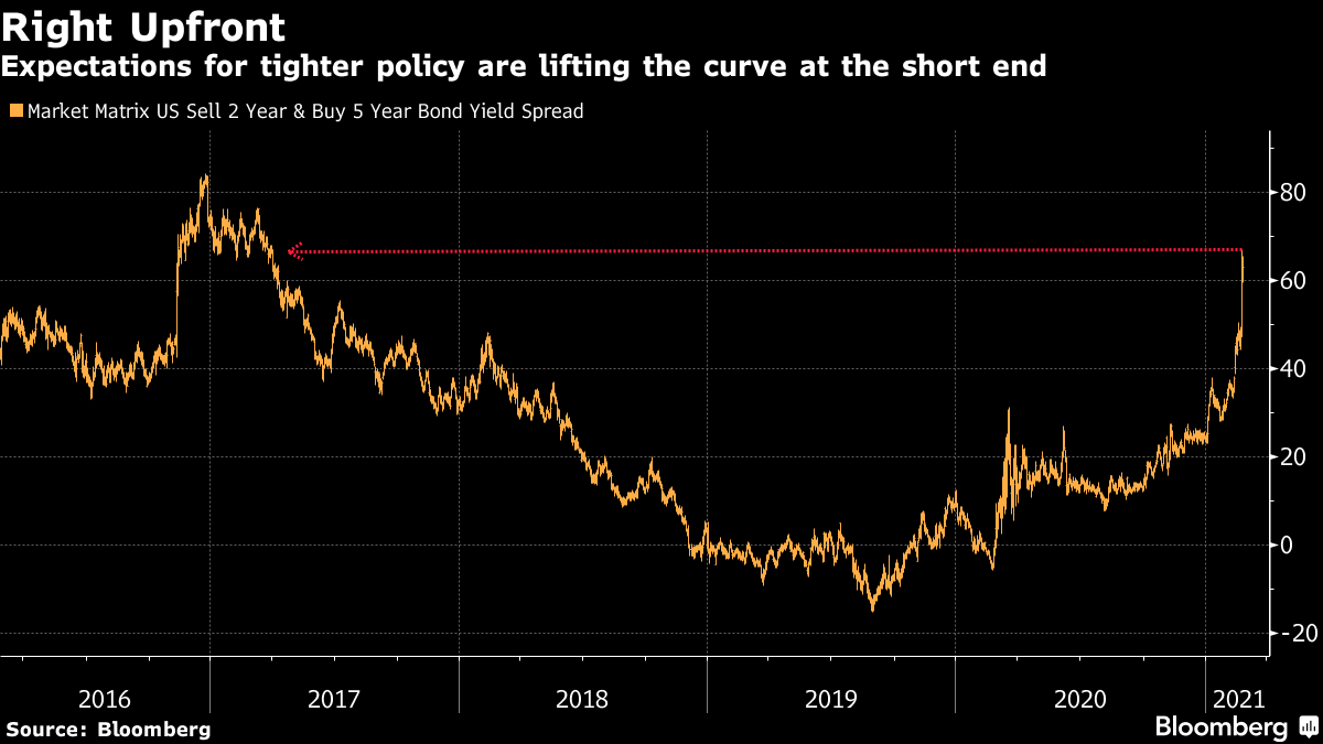 尽管近期曲线陡峭的走势引起了很多关注,但对前端的关注却较少。两到五年期间的走势发生了相当大的变化,因为有关货币政策收紧的猜测蔓延到了市场波动性被忽视的部分。