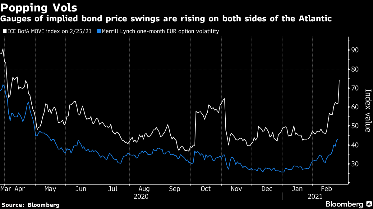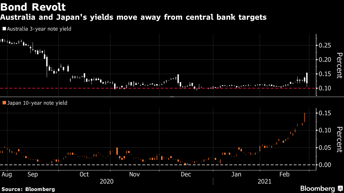 这一切都在债券市场上演。人们越来越确信疫苗的成功可能会使生活恢复正常的速度超出预期,并带来需求的激增,这推高了全球政府借贷利率。现在我们看到对中央银行的压力正在增加,他们承诺保持低利率以确保经济完全复苏。