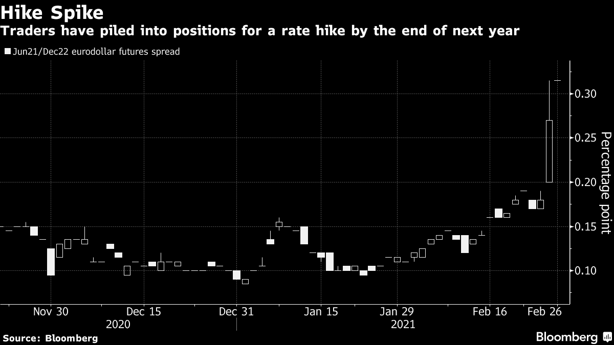 这并没有阻止美国利率市场的交易员更加积极地为货币政策收紧做准备,比美联储目前设想的时间更早。在本周债券市场动荡的高峰期,欧元美元期货几乎已经完全定价,预计明年底将加息一个百分点。
