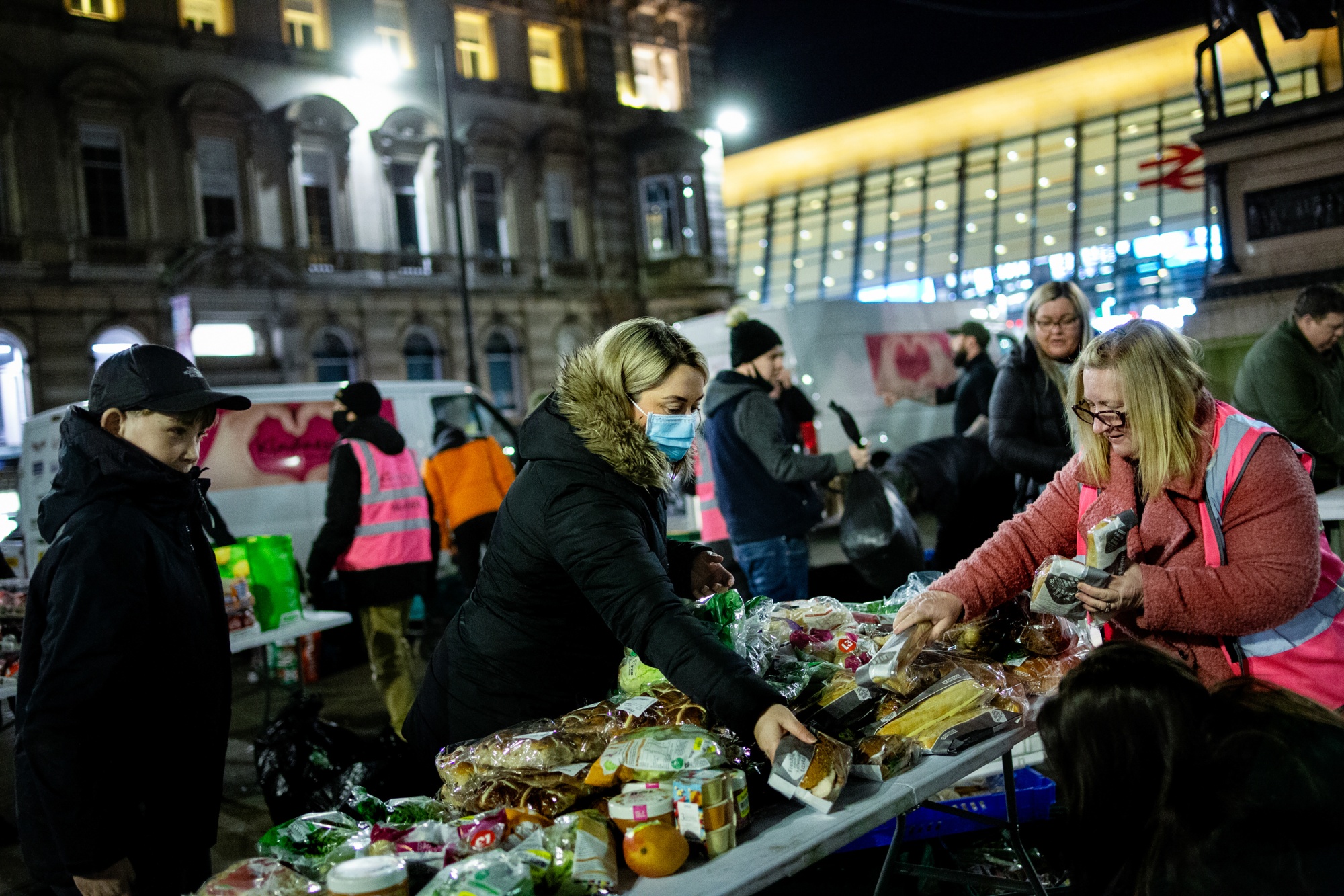 来自Kindness Homeless Street Team慈善机构的志愿者在英国格拉斯哥的乔治广场准备食物,日期为2月22日。摄影师:Emily Macinnes/Bloomberg
