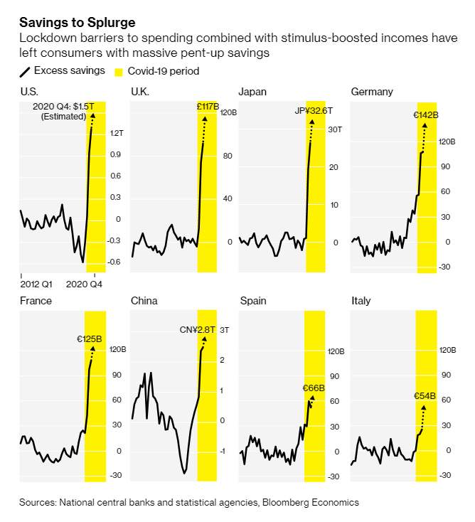 在世界最大经济体中,消费者在疫情相关封锁期间积累了2.9万亿美元的额外储蓄,这是一笔巨额现金储备,为从疫情衰退中强劲复苏创造了潜力。根据彭博经济学的估计,美国、中国、英国、日本和欧元区最大的国家的家庭在被新冠病毒迫使呆在家里和不去商店时储蓄了资金。