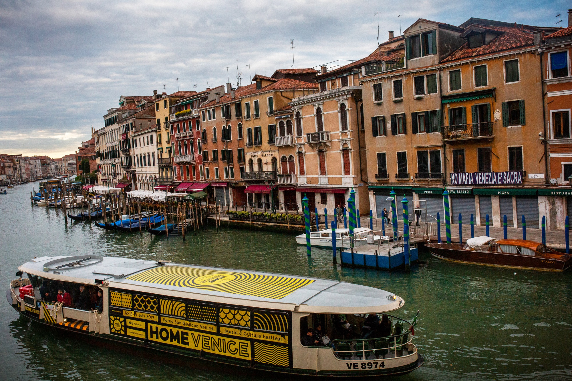 一艘水上巴士,带着写着“没有黑手党,威尼斯是神圣的”横幅,在威尼斯的大运河上航行。摄影师:Federico Vespignani/Bloomberg