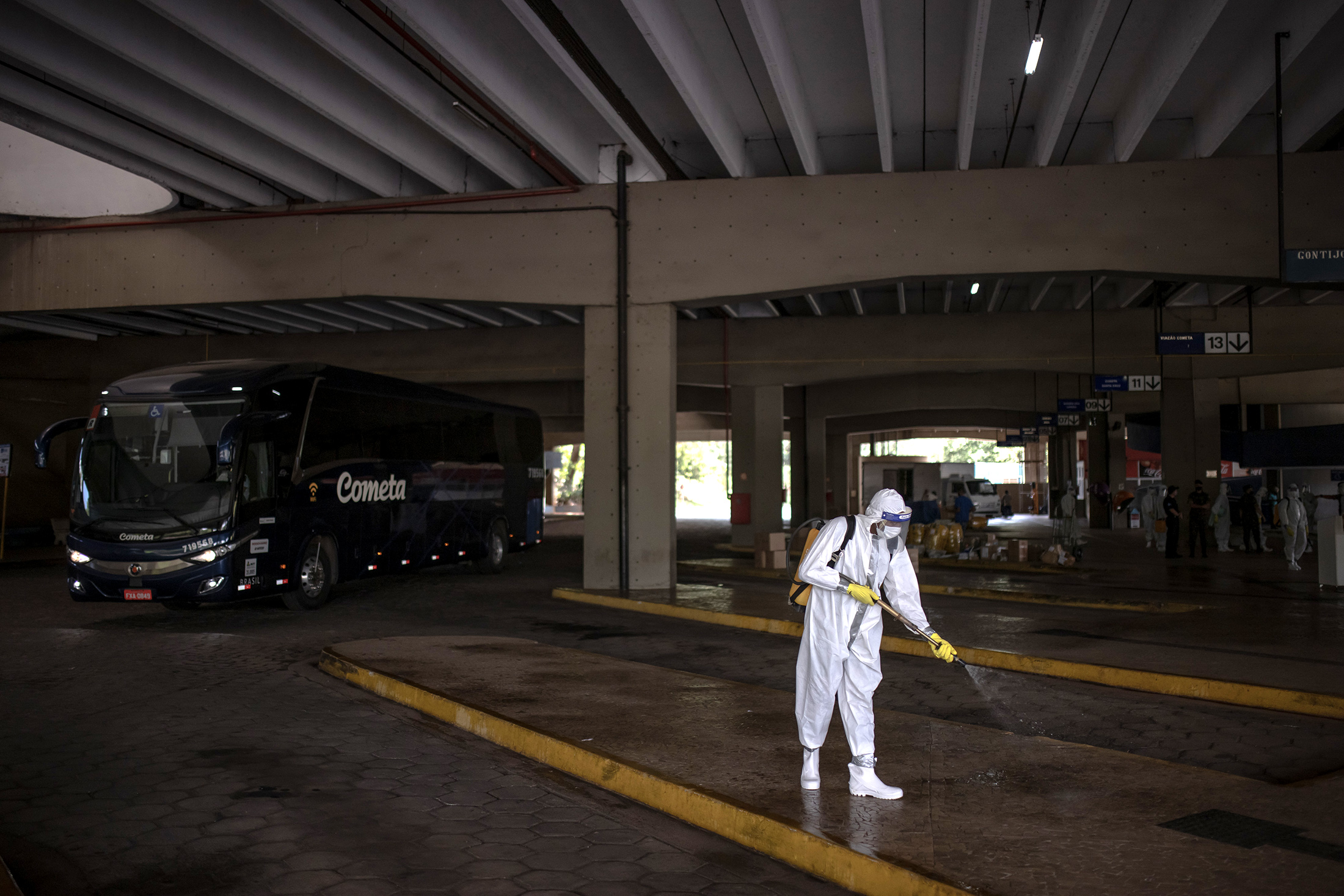 巴西军队成员对阿拉拉夸拉市公交车站进行消毒。该市已经封锁了一周多。摄影师:乔恩·罗里兹/彭博社