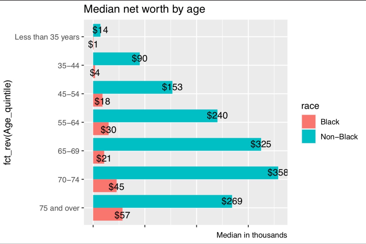 越来越多的黑人,他们历史上被剥夺了获取财富的机会,正在做我们一直被告知要做的事情以取得进展:上大学。而且这是有效的。他们中的更多人得到了能让他们进入更高税收档位的工作,但这并不意味着他们和他们的白人同事一样有能力偿还贷款。要明确的是,财富——拥有的所有资产(房屋、股票、401K)减去持有的债务(学生贷款、医院账单)——与一个人从工作中赚取的收入是不同的。