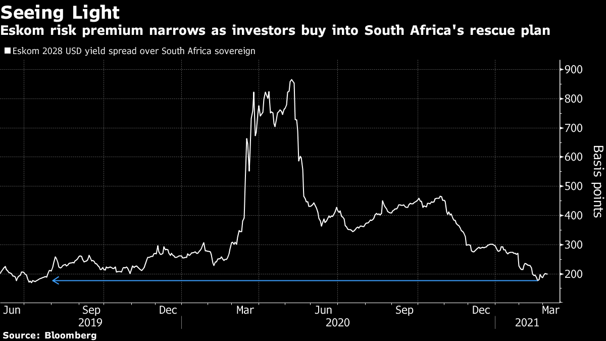 - 南非国家电力公司Eskom的风险溢价在上周缩小至19个月低位,并即使在全球债券动荡中仍保持在该水平附近。收益率表明债券持有人认为他们的资金在这家陷入困境的国有电力公司最新一轮救援谈判中是安全的。