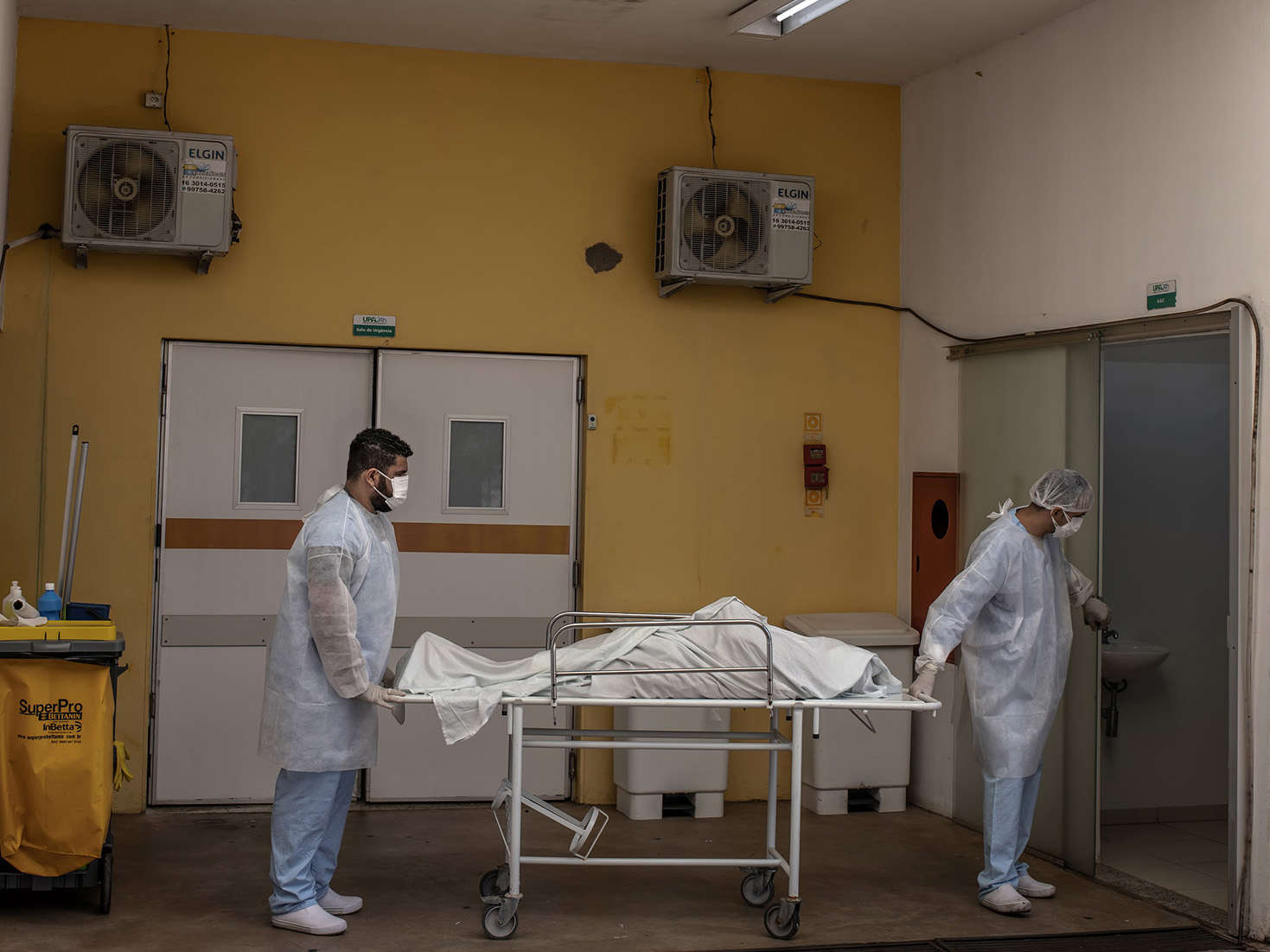 卫生工作者在2月23日将一名新冠肺炎患者的遗体运送到巴西圣保罗的维拉·沙维尔医院。