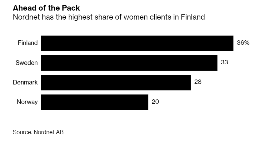 在芬兰,世界上最幸福的国家,女性开始在股市中交易更大比例的股票,这一发展突然使她们在世界上最平等的地区之一获得了优势。根据北欧地区主要零售经纪商之一 Nordnet AB 的数据,过去两年内交易股票和基金的芬兰女性数量翻了一番,现在占总数的三分之一以上。这一发展与芬兰努力成为世界上最具金融素养的国家的努力同时发生。