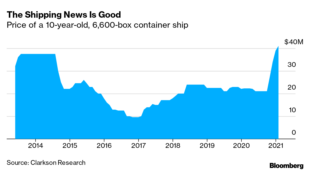一些集装箱船东选择将船只卖到一个炙手可热的市场,在过去五年中,船舶价格已经翻了四倍。二手船舶的回报延伸了一个全速运行的海洋货运行业,刺激了新船的销售,这是多年来首次增长,并推动租船活动达到十多年来的最高水平。