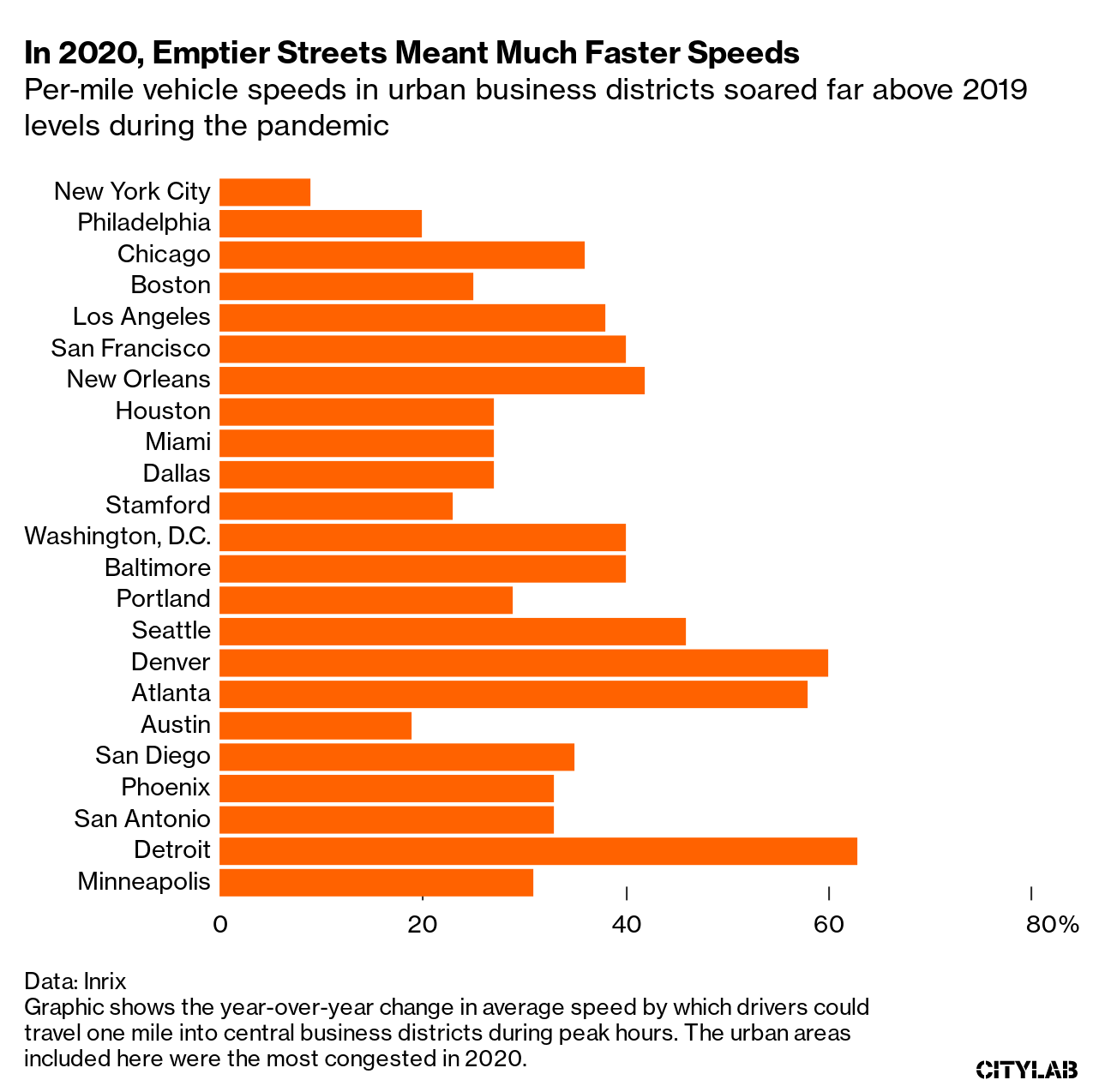 专家表示,道路上车速飙升是主要可能原因。交通分析公司Inrix的数据显示,全国最拥堵的城市地区的平均车速同比增长35%,同时节省的行驶时间达到40%甚至更多。