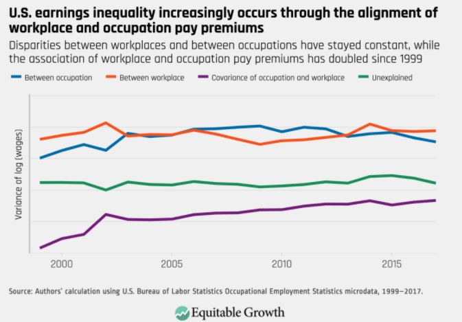 Bloomberg然而,增加的是工作场所和职业溢价之间的共同变动。在过去20年里,这一比例翻了一番。换句话说,高薪工作(职业)更有可能出现在高薪公司(工作场所)中,而不像以前那样。低薪工作也是如此,越来越多地出现在低薪工作场所。因此,看起来不仅工资不平等存在问题,企业社会结构也存在问题。(可以这样理解,不仅要去正确的学校学习成为正确的人,还必须在正确的公司工作)。